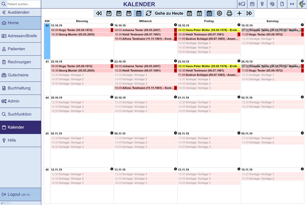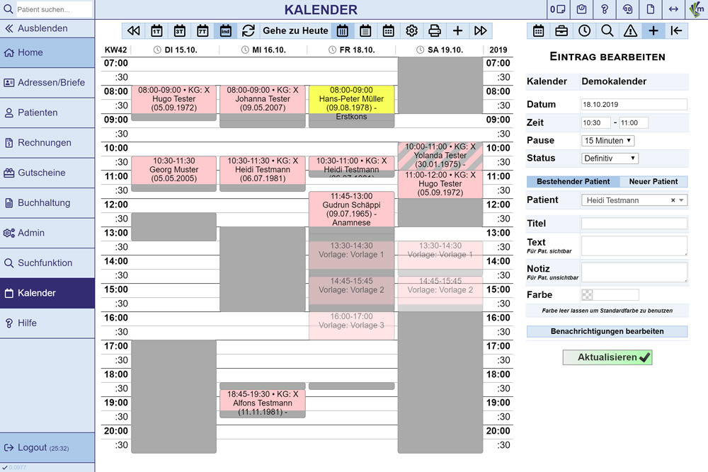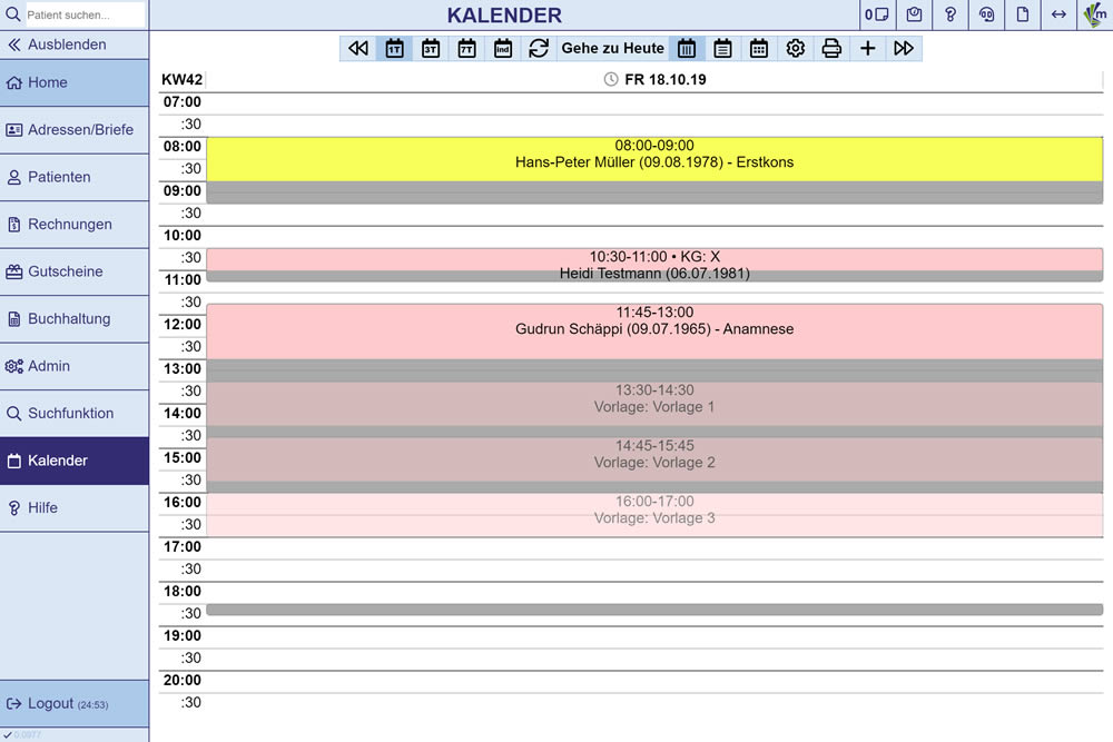 Der in masuyo eingebaute Kalender ermöglicht eine komfortable und leistungsstarke Terminverwaltung. Im Unterschied zu anderen Kalenderanwendungen wie z.B. Google Kalender ist der masuyo Kalender direkt mit Ihrer Patientenverwaltung verbunden, so dass Termine direkt einer Patientin oder einem Patienten zugeordnet werden können. So kann direkt aus dem Kalender ein KG-Eintrag angelegt werden und es kann am Ende eines Arbeitstages überprüft werden, ob für alle Termine ein KG-Eintrag angelegt wurde, was für die Abrechnung wichtig ist.
