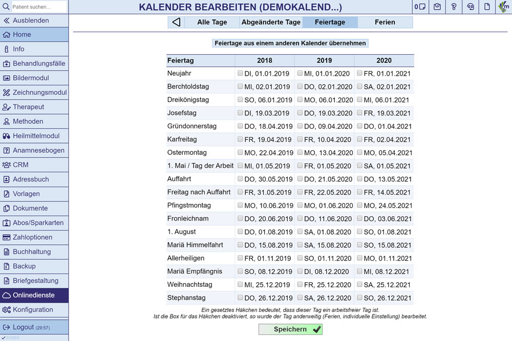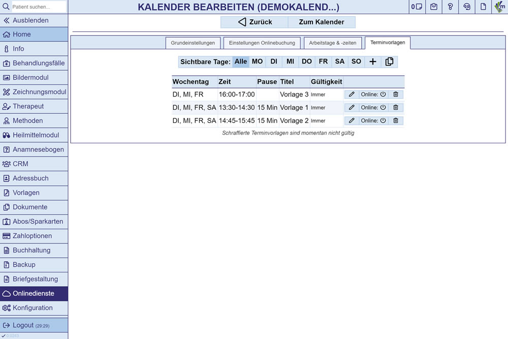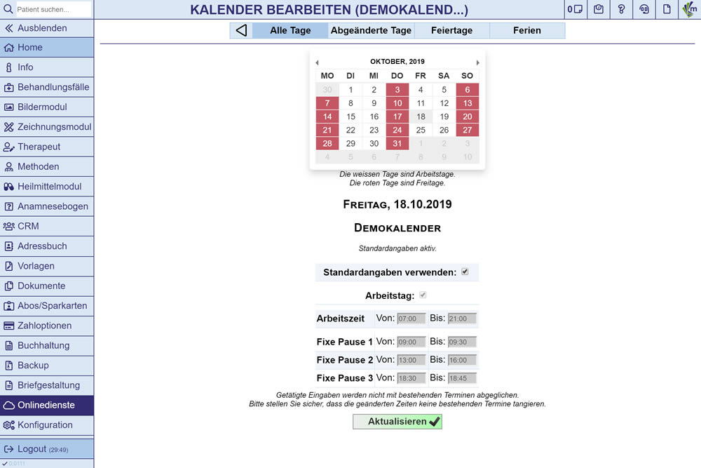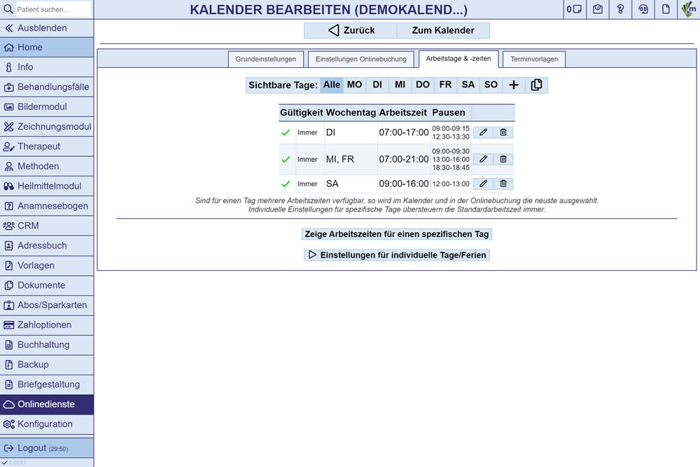 Die Onlinebuchung ist ein Zusatzmodul zum Kalender und ermöglicht es Ihren Patientinnen und Patienten, sich selber Termine über Ihre Homepage zu vergeben. Sie können aus mehreren Varianten wählen, wie Termine in Ihren Arbeitszeiten angelegt werden, beispielsweise nach fixen Terminvorlagen oder flexibel je nach zur Verfügung stehender Zeit. Natürlich können Sie Ihre Arbeitszeiten hinterlegen und diese individuell für gewisse Tage anpassen sowie Ferien und Feiertage eingeben, für welche die Onlinebuchung dann automatisch gesperrt wird.