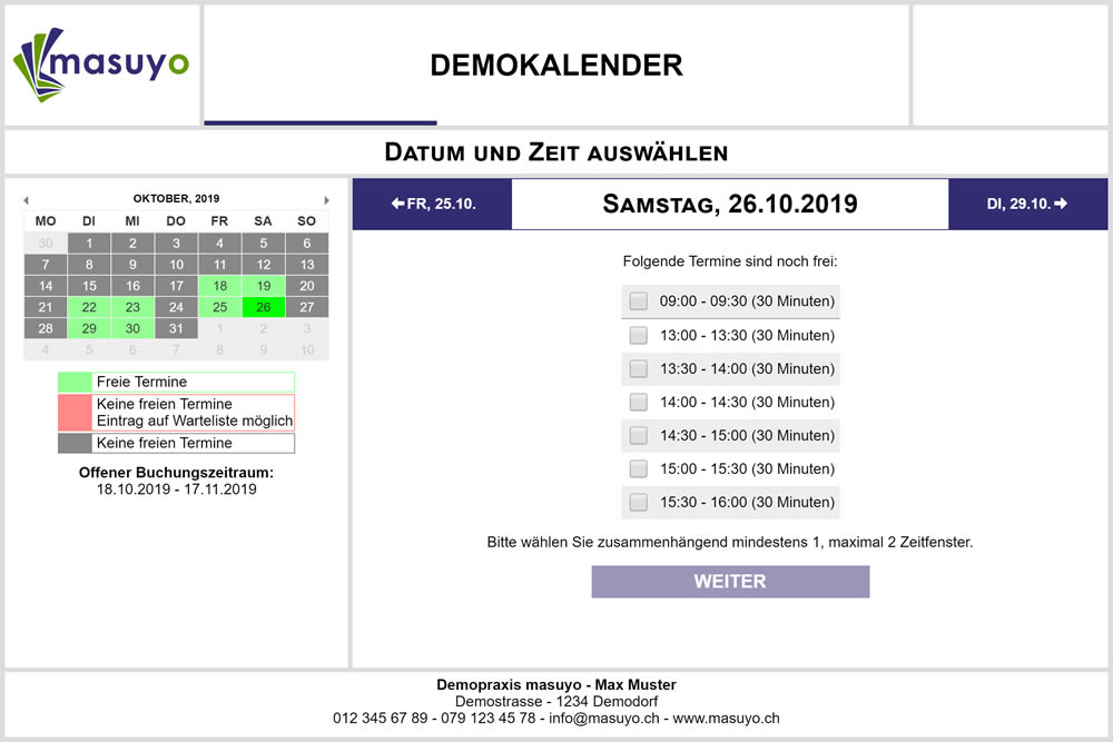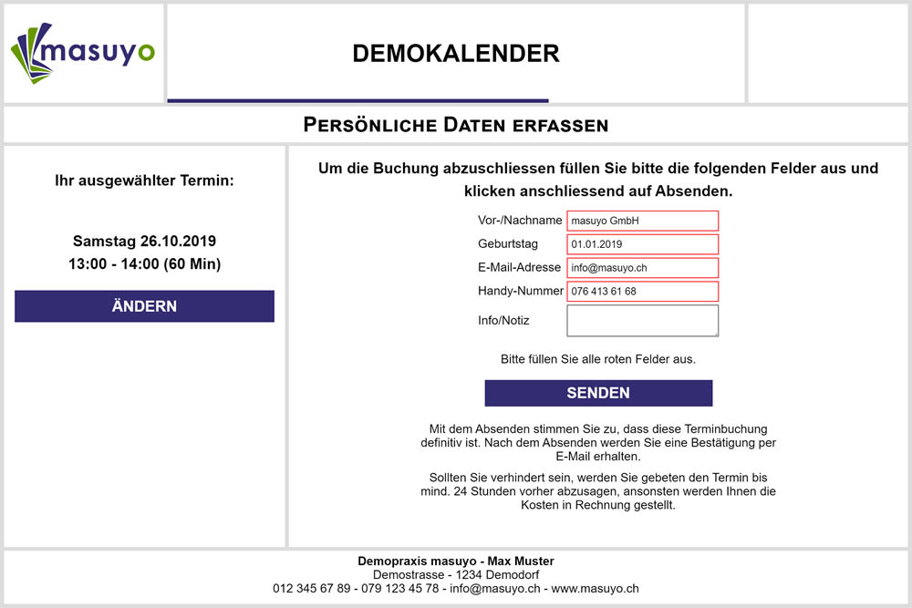 Testen Sie die Onlinebuchung für den Kalender in der Demoversion.