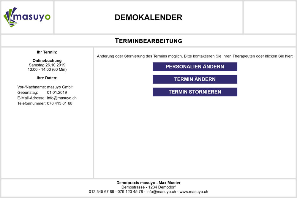 Die Onlinebuchung läuft auf dem gesicherten masuyo Server und wird in Ihre bestehende Homepage ganz einfach durch einen Link eingebunden. Die Darstellung der Onlinebuchung ist für alle Geräte optimiert und funktioniert auch auf dem Smartphone ausgezeichnet.